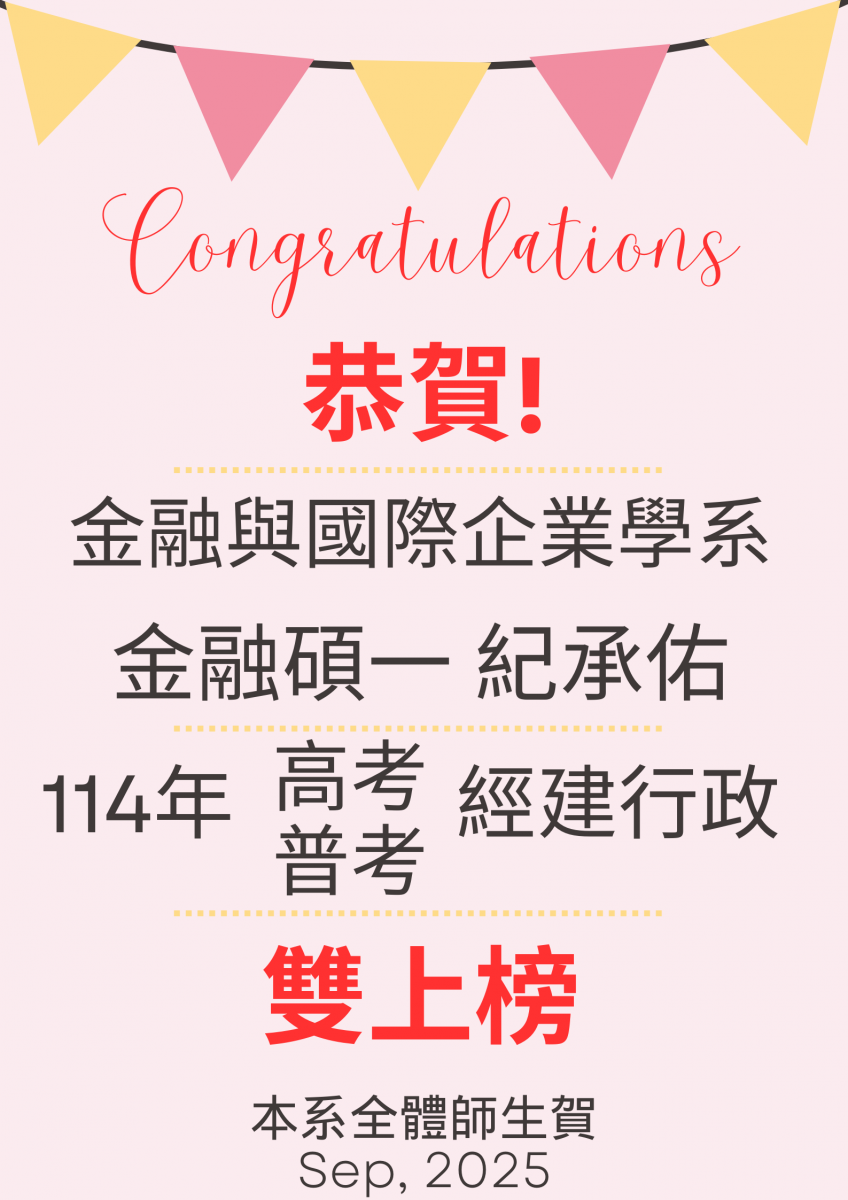114學年度重要 113學年度重要 112學年度重要 111學年度重要 110學年度重要 109學年度重要 108學年度重要 107學年度重要 106學年度重要 105學年度重要 114學年度重要 首頁 最新消息 114學年度重要 恭賀!金融碩一紀承佑--114年高考及普考(類別:經建行政)雙上榜 2025.09.23 恭賀!金融碩一紀承佑--114年高考及普考(類別:經建行政) 雙上榜!! Top Back