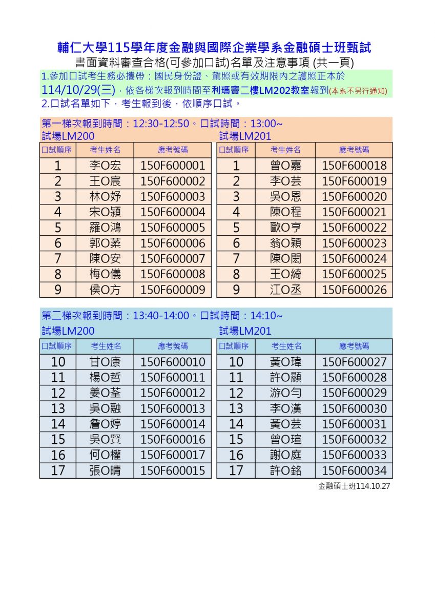 114學年度重要 113學年度重要 112學年度重要 111學年度重要 110學年度重要 109學年度重要 108學年度重要 107學年度重要 106學年度重要 105學年度重要 114學年度重要 首頁 最新消息 114學年度重要 115學年度金融碩士班甄試書面審查合格名單(可參加口試) 2025.10.23 輔仁大學115學年度金融與國際企業學系金融碩士班甄試 時間:114年10月29日(星期三)下午,請依報到時間抵達,若提前到校可提早入場休息。 報到地點:利瑪竇二樓LM202會議室 114/10/27更: Top Back